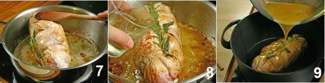Faites dorer le rôti sur toutes ses faces, en le tournant avec une cuillère en bois 7, puis ajoutez le vin 8. Lorsque le rôti est bien doré, transférez-le dans un plat allant au four, où vous verserez également le fond de cuisson 9.