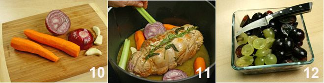 Nettoyez les carottes, le céleri, les oignons et l'ail 10 et placez-les dans la casserole avec les baies de genièvre, le persil, le sel et le poivre 11. Laissez cuire dans le four déjà chaud pendant une heure à 180° (en retournant le rôti de temps en temps). Pendant ce temps, lavez bien les raisins, coupez les grains en deux et enlevez les pépins 12.
