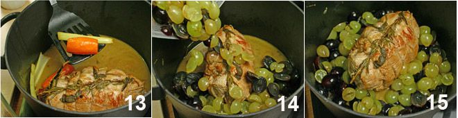 Après une heure de cuisson, retirez les légumes et les arômes de la casserole, en ne laissant que le fond de cuisson 13, puis ajoutez les grains de raisin (14-15) et faites cuire pendant encore 20 minutes en maintenant la température à 180°. Une fois le four éteint, laissez reposer le rôti quelques minutes, puis coupez-le en tranches et servez-le avec les raisins en ajoutant le jus formé pendant la cuisson.