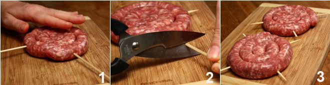 Allumez le four et préchauffez-le à 200°. Prenez la saucisse luganega, enroulez-la en deux spirales que vous fixerez ensuite en les transperçant avec deux brochettes en « croix » 1, une fois la luganega transpercée, coupez la partie des brochettes qui dépasse (2-3).
