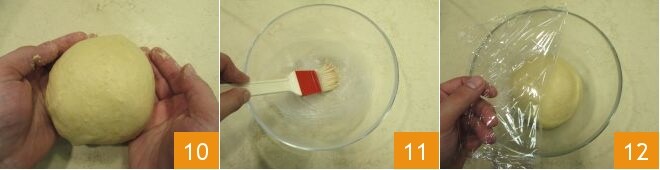 Poursuivez jusqu'à ce que la pâte soit accrochée au crochet, puis placez-la sur un plan de travail et donnez-lui une forme ronde 10, beurrez un bol 11, déposez la boule de pâte, couvrez avec du film plastique 12 et laissez lever dans le four éteint avec la lumière allumée pendant environ 4 heures ou jusqu'à ce que la pâte ait triplé de volume.