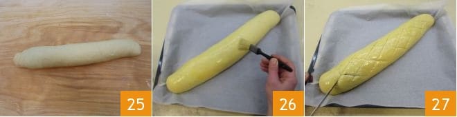 Vous aurez obtenu votre roulé 25, déposez-le sur une plaque recouverte de papier sulfurisé 26, badigeonnez la surface avec l'œuf battu 27,