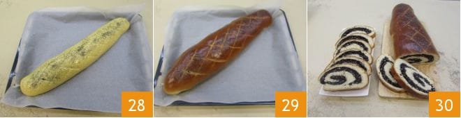 incisez la surface avec un couteau à lame lisse avec des diagonales croisées de manière à créer un motif en losanges 28, saupoudrez avec les graines de pavot 29 et faites cuire dans un four statique préchauffé à 170° pendant 30 minutes (ou dans un four ventilé à 150° pendant 20 minutes). Une fois la cuisson terminée, sortez le roulé aux graines de pavot, amandes et massepain, laissez-le refroidir puis servez-le en tranches 30.