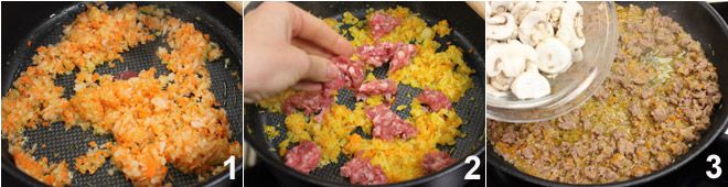 Pour préparer le rouleau de polenta avec saucisse et champignons, commencez par éplucher la carotte, l'ail et l'oignon, puis émincez-les avec la branche de céleri : mettez le hachis dans une grande casserole où vous aurez fait chauffer 4-5 cuillères à soupe d'huile d'olive extra vierge 1. Laissez fondre à feu doux pendant environ 15 minutes sans laisser colorer, puis ajoutez la saucisse émiettée 2 et augmentez un peu le feu pour faire dorer la viande. Déglacez avec un verre de vin blanc (à température ambiante) puis ajoutez le poivre moulu, les champignons 3 bien nettoyés et coupés en tranches pas trop fines et laissez cuire pendant environ 10-15 minutes, à feu doux en ajustant le sel. Quand les champignons sont tendres, ajoutez la tomate, laissez cuire quelques minutes jusqu'à ce que la sauce réduise, puis ajustez encore si nécessaire le sel,