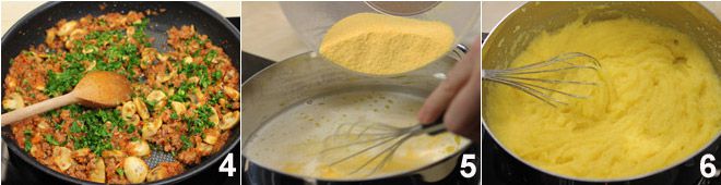 ajoutez le persil haché 4 mélangez et éteignez le feu. Préparez la polenta en versant dans une casserole (de préférence antiadhésive) l'eau et portez-la à ébullition : ajoutez le sel et ensuite l'huile d'olive extra vierge, puis versez en pluie la farine dans l'eau bouillante en mélangeant vigoureusement avec un fouet 5 pour éviter la formation de grumeaux. Laissez cuire à feu doux pendant au moins 5 minutes en remuant continuellement 6, puis éteignez le feu et