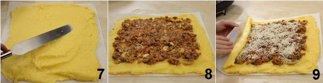 versez la polenta sur un rectangle de papier sulfurisé de dimensions 30 cm x 35 cm, en l'étalant et en lissant bien 7. Versez sur le rectangle de polenta le mélange de saucisse et champignons 8, en en réservant deux cuillères pour la décoration finale ; répartissez le mélange sur toute la surface en laissant tout autour un bord libre de 3-4 cm, puis saupoudrez de 4 cuillères à soupe de fromage râpé 9.