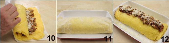 En vous aidant avec la feuille de papier sulfurisé, commencez immédiatement à rouler la polenta encore chaude 10, jusqu'à former un cylindre que vous fermerez avec le papier sulfurisé 11 et que vous laisserez reposer quelques minutes avec l'extrémité orientée vers le bas, avant de le déposer dans un plat huilé avec une cuillère d'huile d'olive extra vierge. Avant de le mettre au four, saupoudrez le dessus du rouleau avec le mélange de saucisse, saupoudrez-le d'une cuillère de fromage râpé 12 et enfournez le rouleau de polenta dans le four préchauffé à 200° pour environ 20-25 minutes. Une fois le temps écoulé, sortez le rouleau de polenta avec saucisse et champignons, laissez-le reposer 10 minutes et servez-le ensuite en le découpant en tranches.