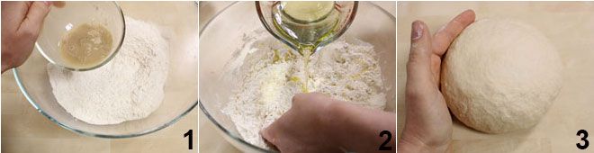 Pour préparer les roulés à la sardella, commencez par la pâte à pain : dissolvez la levure de bière dans un peu d'eau tiède, avec une cuillère à café de malt (ou de sucre) et ajoutez-la aux deux farines que vous aurez tamisées ensemble dans un bol ou sur un plan de travail 1. Dans le reste de l'eau tiède, dissolvez le sel, ajoutez l'huile et versez lentement ce liquide sur la farine, en mélangeant avec des mouvements amples et rapides, jusqu'à épuisement 2. Pétrissez pendant une dizaine de minutes, jusqu'à obtenir une pâte compacte, lisse et élastique 3, que vous placerez dans un bol fariné, couvert de film plastique, et laisserez lever pendant environ deux heures dans le four éteint et fermé. Pour des indications plus détaillées sur la façon de faire la pâte à pain cliquez ici.