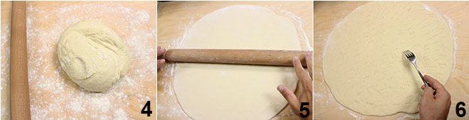 Une fois que la pâte a doublé de volume, transférez-la sur un plan de travail fariné 4 et étalez-la uniformément pour former un cercle d'environ 1 cm d'épaisseur 5. Piquez la surface avec les dents d'une fourchette 6.