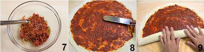 Préparez maintenant la garniture : mettez la sardella dans un bol et ajoutez l'huile en remuant avec une fourchette 7. Étalez la sardella sur la surface du disque de pâte, en laissant un bord d'environ un demi-centimètre 8 et roulez-le, en partant du bas vers le haut 9.