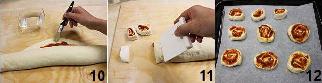 Avant de le fermer, scellez le rouleau en badigeonnant de l'eau le long du bord 10. Coupez maintenant le rouleau en morceaux d'environ deux centimètres de large 11 et placez les roulés obtenus sur une plaque recouverte de papier sulfurisé 12. Enfournez-les à 200° dans un four statique pendant 20-25 minutes et servez vos roulés à la sardella encore tièdes !
