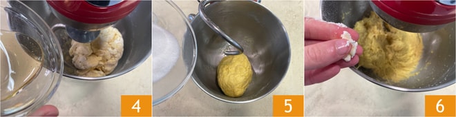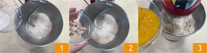 Pour préparer les pains au chocolat, nous vous conseillons d'utiliser le robot pâtissier, mais si vous ne l'avez pas, pétrissez à la main dans le même ordre. Mettez donc la farine dans le bol avec le lait 1 et la levure émiettée 2. Actionnez le robot avec le crochet à vitesse moyenne et versez les œufs et le jaune, battus ensemble, petit à petit 3.
