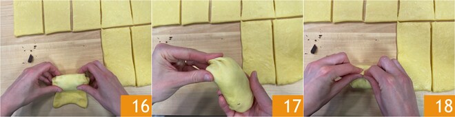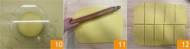 Lorsque la pâte a doublé de volume 10, étalez-la sur le plan légèrement fariné et formez un rectangle de 30 cm x 40 cm. Divisez-le en deux et obtenez 10 pièces de 15 cm par 8 cm 12.
