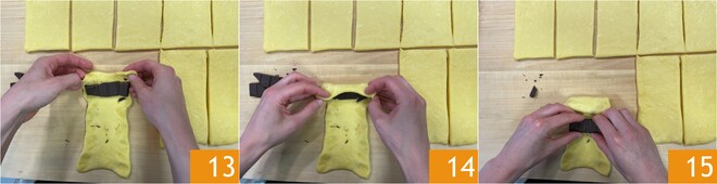Pour obtenir les pains au chocolat, procédez de la manière suivante : prenez le premier rectangle de pâte et aplatissez-le délicatement, puis placez en haut un morceau de barre de chocolat 13 et commencez à rouler serré 14. À mi-chemin, ajoutez la deuxième bande de chocolat 15