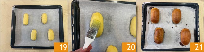 Une fois que vous les avez tous préparés, disposez-les sur une plaque de cuisson recouverte de papier sulfurisé en les espaçant un peu 19. Couvrez-les avec du film alimentaire et laissez-les lever pendant environ 30 minutes. À ce stade, badigeonnez la surface avec du jaune d'œuf et de la crème 20. Ensuite, faites cuire les pains au chocolat dans un four statique à 200° pour environ 15 minutes puis baissez à 180° en poursuivant la cuisson pendant encore 10 minutes. Voilà vos pains au chocolat prêts 21.