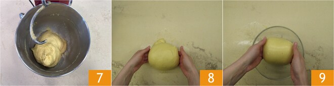 Lorsque le beurre est bien incorporé, ajoutez le sel et après quelques minutes, la pâte sera prête 7. Renversez-la sur le plan de travail et laissez-la reposer pendant 5 minutes, couverte par le bol. Avec les mains mouillées, donnez-lui quelques tours de renforcement, en soulevant et en appuyant la pâte vers l'avant, puis en la tirant vers vous 8. Mettez dans un bol, couvrez et laissez lever jusqu'à ce qu'elle double de volume, cela prendra environ 2 heures 9.