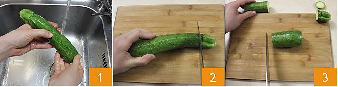Pour préparer la salade de courgettes à la menthe et au basilic, commencez par laver soigneusement les courgettes sous l'eau courante 1. Séchez-les avec un chiffon et placez-les sur une planche à découper, puis nettoyez-les en éliminant les deux extrémités 2. Ensuite, coupez la courgette en deux 3.