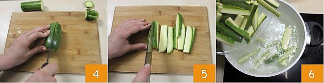 Coupez-la encore en deux dans le sens de la longueur 4 et commencez à découper des tranches d'environ 1,5 cm de large 5. Maintenant, prenez une grande casserole, remplissez-la d'eau et portez à ébullition. Ensuite, versez les courgettes tranchées dans l'eau bouillante 6.