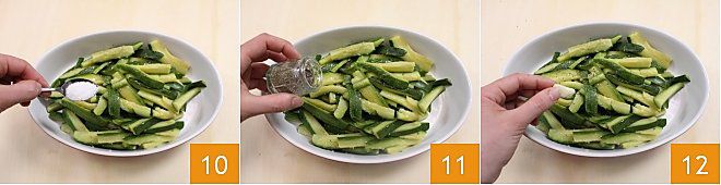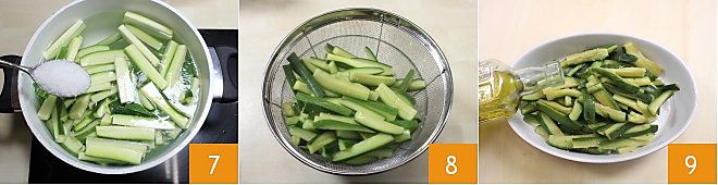 Ajoutez une cuillère à soupe de gros sel 7 et laissez cuire pendant 10 minutes. Après les 10 minutes, égouttez les courgettes avec une passoire et laissez-les refroidir 8. Ensuite, transférez-les dans un plat et assaisonnez-les avec un filet d'huile d'olive extra vierge 9.