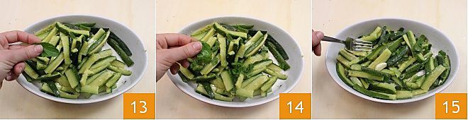 Ajoutez ensuite les feuilles de menthe en morceaux 13 et les feuilles de basilic 14. Mélangez le tout avec une fourchette 15 ou une cuillère et votre salade de courgettes à la menthe et au basilic est prête à être servie et consommée, tiède ou froide. Si vous ne la servez pas tout de suite, gardez-la au réfrigérateur jusqu'au moment de la consommer !