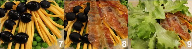 ajoutez une couche d'olives 7 et une de lanières de bacon 8, recouvrez avec les feuilles de laitue 9. Terminez la composition avec les œufs durs coupés en quartiers. Servez la salade aux sept couches et assaisonnez-la à votre goût avec de l'huile, du sel et du vinaigre.