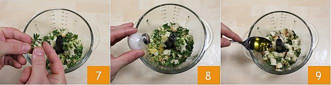 et les feuilles de marjolaine 7. Assaisonnez ensuite de sel et de poivre 8 et ajoutez également les deux cuillères à soupe d'huile d'olive extra vierge 9.