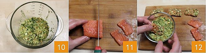 Hachez grossièrement le mélange 10, pas trop finement donc, et transférez-le dans un bol. À ce stade, occupez-vous du saumon, séchez bien les filets et découpez 12 tranches de la même taille que les galettes sur lesquelles ils seront posés 11. Passez les filets de saumon ainsi obtenus dans la panure 12, en la faisant bien adhérer de tous les côtés.