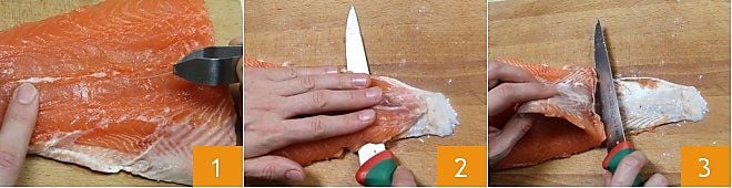 Pour préparer le saumon mariné au four, commencez par nettoyer le filet de saumon (si vous avez acheté un saumon entier, vous devrez retirer les entrailles et le fileter). Avec l'aide d'une pince de cuisine, retirez les arêtes 1, puis enlevez la peau délicatement avec un couteau bien aiguisé en partant de la queue (2-3) afin de séparer la peau du filet.