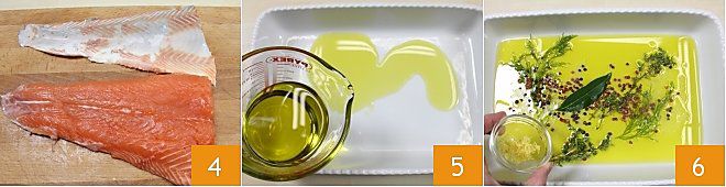 Une fois nettoyé, vous devriez obtenir environ 800 g de filet de saumon 4. À ce stade, vous pouvez vous occuper de la marinade: versez l'huile dans un plat en céramique ou en verre à bords hauts 5. Ajoutez tous les arômes: le jus de citron et le zeste râpé 6,