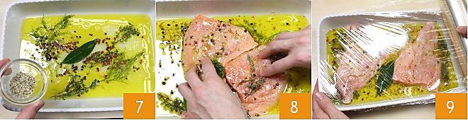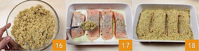 et mélangez bien pour humidifier la panure 16. Recouvrez toute la surface du saumon mariné avec la panure humidifiée (17-18). Faites cuire le saumon mariné dans un four préchauffé en mode statique à 180° pendant 10 minutes (ou dans un four ventilé à 160° pendant 6-7 minutes). Passées les 10 minutes, changez le mode du four de statique à grill, augmentez la température à 230° et gratinez le saumon mariné pendant encore 5 minutes. Quand la panure est bien dorée, sortez le saumon mariné du four et laissez-le tiédir quelques minutes avant de le servir.