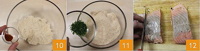 En attendant, préparez la panure en mélangeant la chapelure avec la farine d'amande, puis ajoutez le paprika doux 10, le persil, enfin salez et poivrez. Une fois la marinade terminée, sortez le saumon du frigo au moins une heure avant de le mettre au four, afin qu'il atteigne la température ambiante. Posez-le sur une planche à découper, découpez 4 tranches égales 12, pour une cuisson homogène au four,