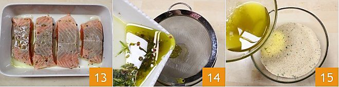et placez-les dans le plat et salez 13. Filtrez l'huile de la marinade à l'aide d'une passoire 14. Ajoutez l'huile filtrée à la panure 15