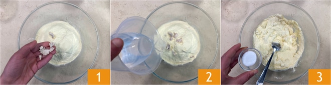 Pour réaliser la scacciata à la Norma, commencez par la pâte : versez la semoule dans un grand bol avec une partie de l'eau tiède 1, puis ajoutez la levure fraîche émiettée 2. Mélangez avec une cuillère pour dissoudre la levure, puis ajoutez le sel sur les côtés du bol 3.