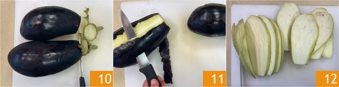Entre-temps, préparez les aubergines : coupez les extrémités des aubergines 10 et, si vous le souhaitez, retirez la peau 11. Coupez les aubergines dans le sens de la longueur en tranches d'environ 1 cm d'épaisseur 12.