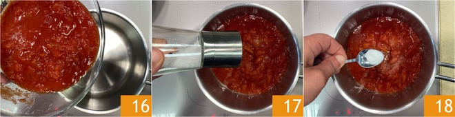 En attendant, occupez-vous de la sauce : versez la pulpe de tomate dans une petite casserole 16, ajoutez le sel 17 et le sucre 18. Mélangez et allumez le feu.