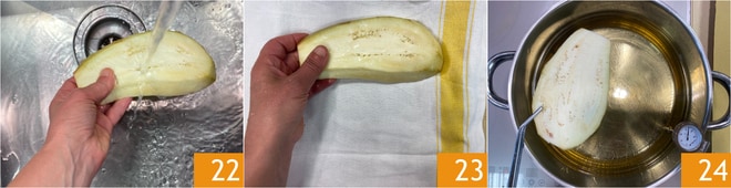 À ce stade, rincez les aubergines pour éliminer le sel 22 et tamponnez-les bien avec un torchon pour les sécher 23, puis procédez à la friture : chauffez l'huile de graines jusqu'à une température de 170° et plongez 1-2 tranches à la fois 24.