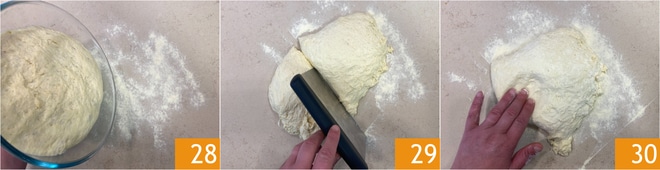 Après le temps de levée, renversez la pâte sur le plan de travail saupoudré de semoule 28, puis divisez-la en deux avec une corne 29. Aplatissez délicatement avec les mains la première partie de la pâte 30.