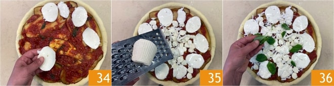 Ajoutez les tranches de mozzarella 34 et râpez la ricotta salée 35, puis complétez avec les feuilles de basilic 36.