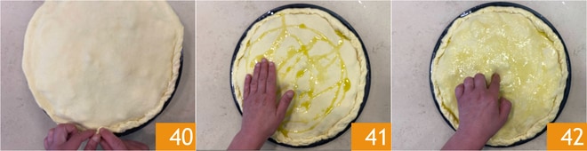Éliminez l'excédent de pâte et retournez le bord vers l'intérieur pour le sceller 40. Huilez la surface 41 et pratiquez un trou au centre, qui servira à laisser échapper la vapeur pendant la cuisson 42.