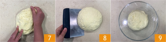 Après ce temps, transférez la pâte sur le plan de travail et travaillez-la vigoureusement avec les mains pendant une dizaine de minutes, sans ajouter de farine 7. Si vous avez beaucoup de difficultés à travailler la pâte, laissez-la reposer à nouveau pendant une dizaine de minutes. Lorsque la pâte n'est plus collante mais lisse et homogène, donnez-lui la forme d'une boule avec l'aide d'une corne 8 et remettez-la dans le bol. Couvrez avec du film alimentaire et laissez lever environ 2 heures, toujours dans le four éteint avec la lumière allumée. Le temps de levée est indicatif, la pâte doit doubler de volume 9.