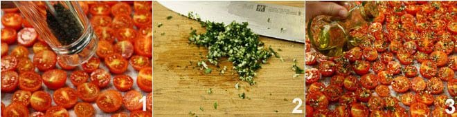 La recette des fougasses à la crème de basilic commence par la préparation des tomates cerises confites : coupez les tomates cerises en deux, disposez-les avec la partie tranchée vers le haut sur une plaque recouverte de papier sulfurisé. Salez, poivrez 1 et saupoudrez les tomates cerises de sucre, thym, ail haché, origan 2, enfin arrosez les tomates cerises d'huile d'olive extra vierge 3 et enfournez à 140°C (four à chaleur tournante) pendant environ une heure et demie.