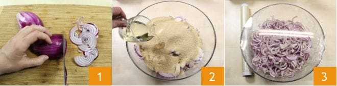 Pour préparer les feuilletés à la confiture d'oignons, commencez par la confiture : épluchez les oignons rouges de Tropea et coupez-les en fines tranches sur une planche à découper 1. Placez les tranches d'oignons dans un grand bol et ajoutez le sucre semoule, le sucre de canne et le vin blanc (ou rosé) 2. Ajoutez également le cognac, une feuille de laurier et mélangez bien pour tout amalgamer. Ensuite, couvrez le bol avec du film plastique et laissez reposer le mélange pendant au moins 6 heures dans un endroit frais et sec, en remuant de temps en temps 3.