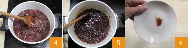 Après ce temps, transférez le mélange dans une casserole et faites-le bouillir à feu très doux pendant environ 25-30 minutes, jusqu'à ce qu'il épaississe 4. Après 30 minutes, votre confiture devrait être prête 5 : prélevez un peu de mélange avec une cuillère à café et laissez tomber une goutte sur une assiette 6 : si elle reste compacte, alors votre conserve sera prête. Si la goutte est trop liquide, poursuivez la cuisson pendant le temps nécessaire en remuant fréquemment. Pour préparer au mieux la confiture d'oignons de Tropea et pour savoir comment et combien de temps la conserver, consultez la recette Confiture d'oignons de Tropea.