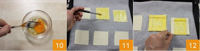 Battez un œuf 10 et badigeonnez la surface des petits carrés à l'aide d'un pinceau 11. Avec les restes de pâte, créez des bandelettes de 1 cm de large et de 8 cm de long et faites-les adhérer aux 4 bords des carrés de pâte 12.