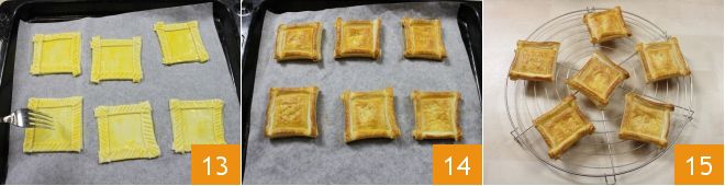 Badigeonnez également ceux-ci avec l'œuf et décorez-les en les incisant avec un cure-dent. Percez le fond des carrés 13 et faites cuire dans un four statique préchauffé à 180° pendant 15 minutes, jusqu'à ce qu'ils soient bien dorés 14 ; si vous utilisez un four ventilé, faites cuire à 160° pendant 10 minutes. Une fois cuits, sortez-les du four et laissez-les refroidir sur une grille 15.