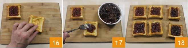 Lorsqu'ils sont froids, cassez délicatement la croûte qui s'est formée au fond des carrés avec le bout des doigts 16 et garnissez chaque feuilleté avec environ 30 g de confiture d'oignons de Tropea 17. Une fois tous les feuilletés garnis, servez et savourez 18 !