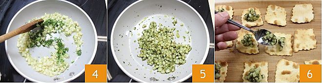 ajoutez le mélange d'herbes dans la poêle 4 et mélangez bien pour tout amalgamer. Laissez cuire le tout à feu moyen pendant 15 à 20 minutes, jusqu'à ce que le topinambour soit ramolli 5. Une fois le topinambour cuit, déposez-en une cuillère à café sur chaque feuilleté 6, puis complétez avec une mouture de poivre noir sur chaque feuilleté.