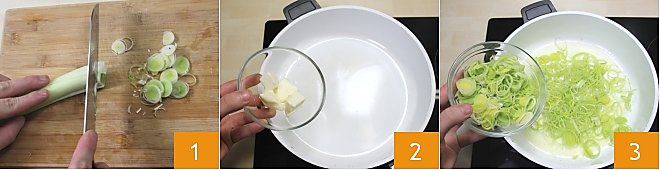Pour préparer les spaghetti au Chianti, nettoyez, lavez et émincez finement le poireau 1, en éliminant les feuilles extérieures les plus dures. Gardez quelques rondelles de poireau pour la garniture finale et faites revenir le reste, à feu doux, dans une poêle antiadhésive avec 30 g de beurre (2-3).