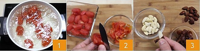 Pour préparer les spaghetti au pesto à la trapanese, suivez la recette du Pesto à la trapanese. Pour commencer, préparez les tomates pelées : mettez sur le feu une grande casserole remplie d'eau. Lavez les tomates et faites une incision en croix à l'extrémité de chaque tomate. Lorsque l'eau commence à frémir, ébouillantez les tomates pendant 2 à 3 minutes 1, puis pelez les tomates 2 et coupez-les en dés. À ce stade, pelez les amandes : faites-les blanchir pendant quelques minutes dans de l'eau bouillante, égouttez-les, puis il suffira d'exercer une légère pression avec les doigts pour retirer la peau 3.