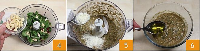 Prenez un mixeur, ou mieux un mortier, mettez-y les tomates pelées, le bouquet de basilic lavé et séché, les amandes 4, une gousse d'ail et mixez le tout pendant quelques minutes. Ajoutez le pecorino râpé 5 et transférez le tout dans un bol. Salez et poivrez, ajoutez quelques cuillères d'huile 6, mélangez bien le tout et transférez le pesto dans un grand bol où vous assaisonnerez ensuite les spaghetti. Si cela semble trop sec, ajoutez un peu plus d'huile.